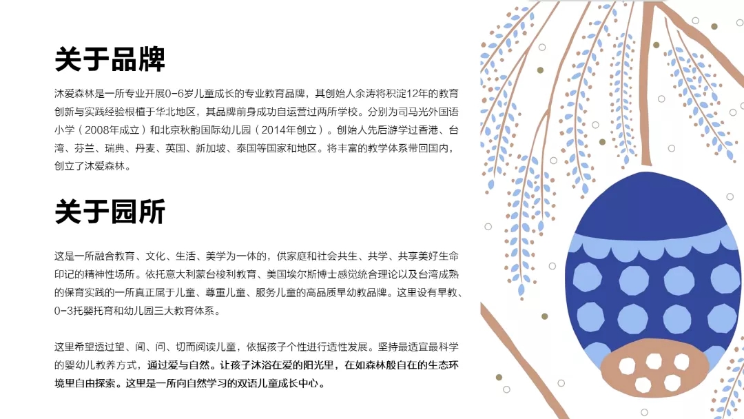 品牌背景:沐愛(ài)森林是一所專業(yè)開(kāi)展0-6歲兒童成長(zhǎng)的專業(yè)教育品牌,這是一所融合教育、文化、生活、美學(xué)為一體的,供家庭和社會(huì)共生、共學(xué)、共享美好生命印記的精神性場(chǎng)所。依托意大利蒙臺(tái)梭利教育、美國(guó)埃爾斯博士感覺(jué)統(tǒng)合理論以及臺(tái)灣成熟的保育實(shí)踐的高品質(zhì)06早幼教品牌。這里設(shè)有母嬰商店、早教、0-3托嬰托育和幼兒園三大教育體系。