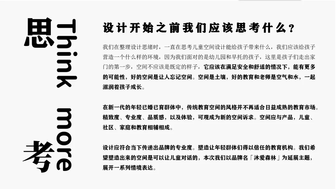 設(shè)計(jì)思考:在新一代的年輕群體中,傳統(tǒng)教育空間的風(fēng)格并不再適合日益成熟的教育市場(chǎng)。精致度、專業(yè)度、品質(zhì)感,以及體驗(yàn),可觀成為新的空間訴求。空間應(yīng)與產(chǎn)品,兒童、社區(qū)、家庭和教育相輔相成。設(shè)計(jì)應(yīng)符合當(dāng)下傳遞出品牌的專業(yè)度。塑造讓年輕群體們得以信任的教育機(jī)構(gòu)。我們希望塑造出來(lái)的空間是可以讓兒童對(duì)話的,本次我們以品牌名「沐愛(ài)森林」為延展主題,展開(kāi)一系列情境表達(dá)。