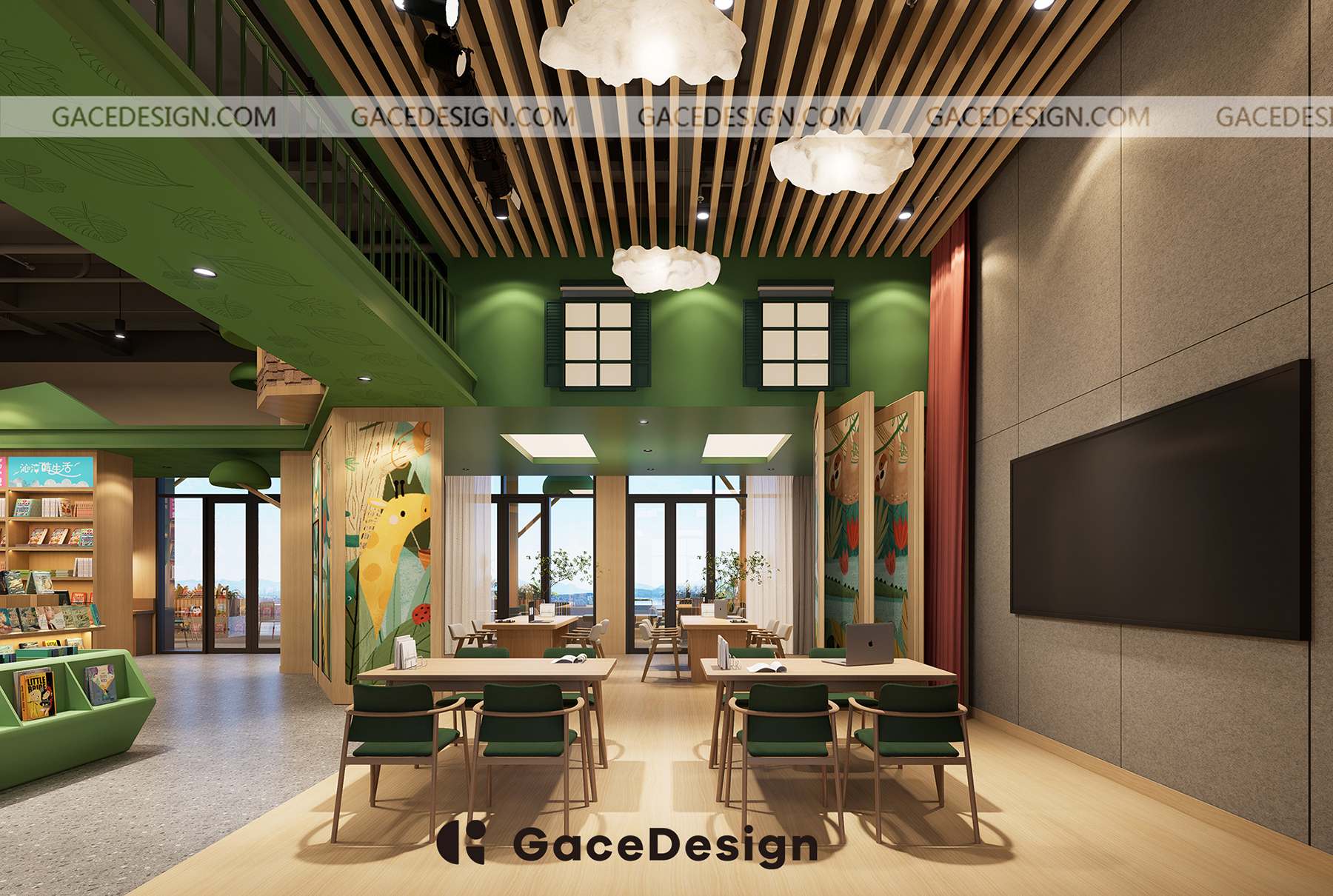 ? “笨狼家·林木森書店”坐落于湘江新區美麗的梅溪湖畔,是以笨狼媽媽湯素蘭童話作品為元素打造的兒童成長、休閑閱讀空間。 旁邊還有一條清澈的梅溪湖,周邊的自然風景很優美。設計師在設計上運用大面積落地玻璃,將內外景觀融合,讓自然與室內結合。