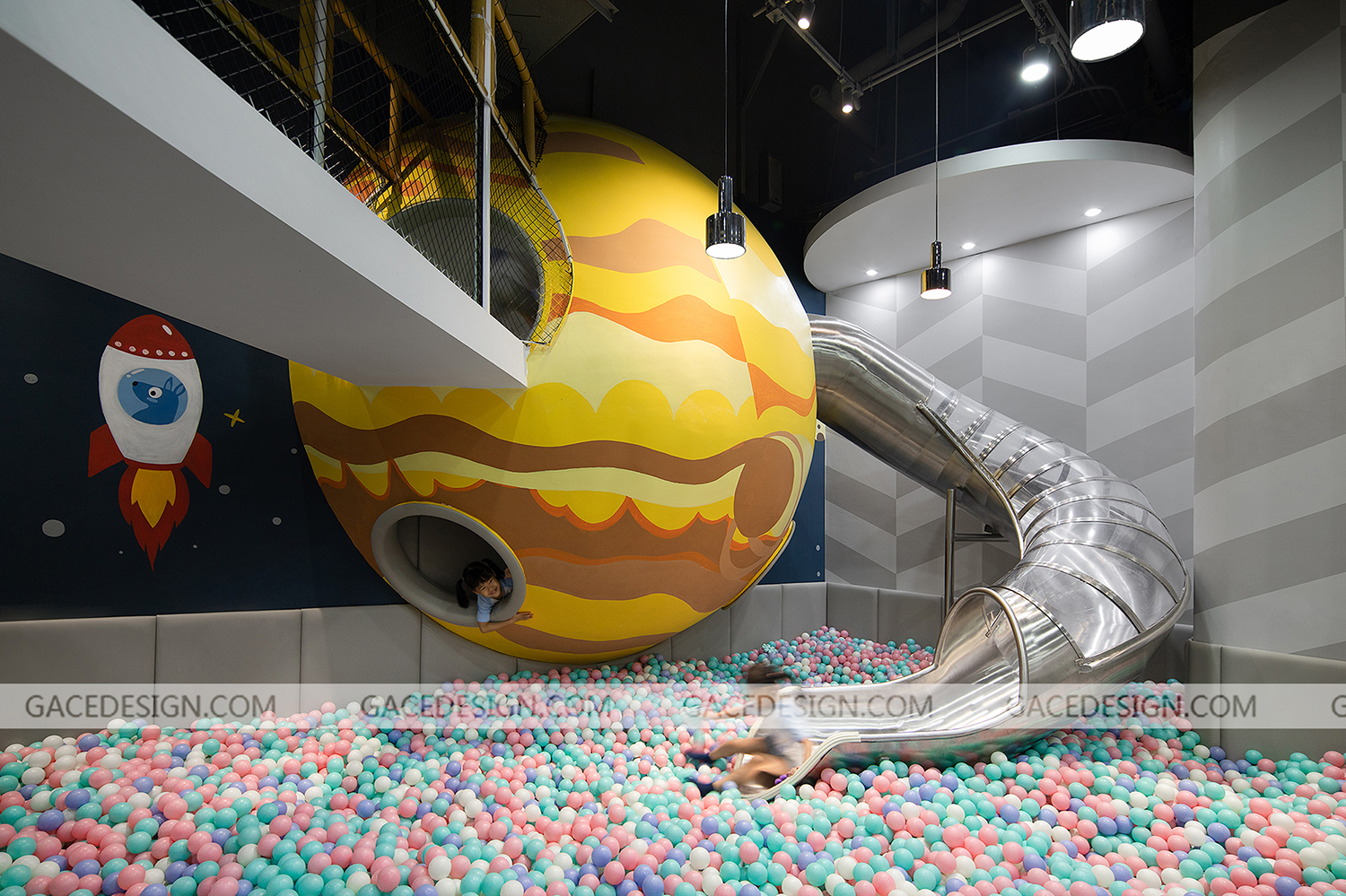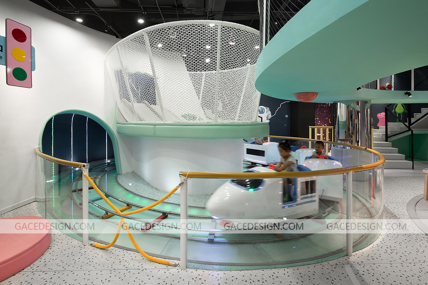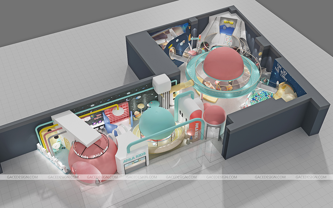 設(shè)計師將游樂場主題定為“未來星球”,以“未來”作為設(shè)計方向,以“星球”做為設(shè)計的核心。各種體量的“星球”在太空中穿行,打造出豐富多彩的星球世界。設(shè)計師根據(jù)孩子的冒險精神設(shè)定多種游戲玩法和路線,孩子進(jìn)入游樂場后,首先需要了解故事背景,在置身其中不斷迎接挑戰(zhàn),最終完成“拯救家園”的任務(wù)。整個游樂場分為前端接待區(qū)、中端靜態(tài)游戲區(qū)、后端動態(tài)游戲區(qū)。