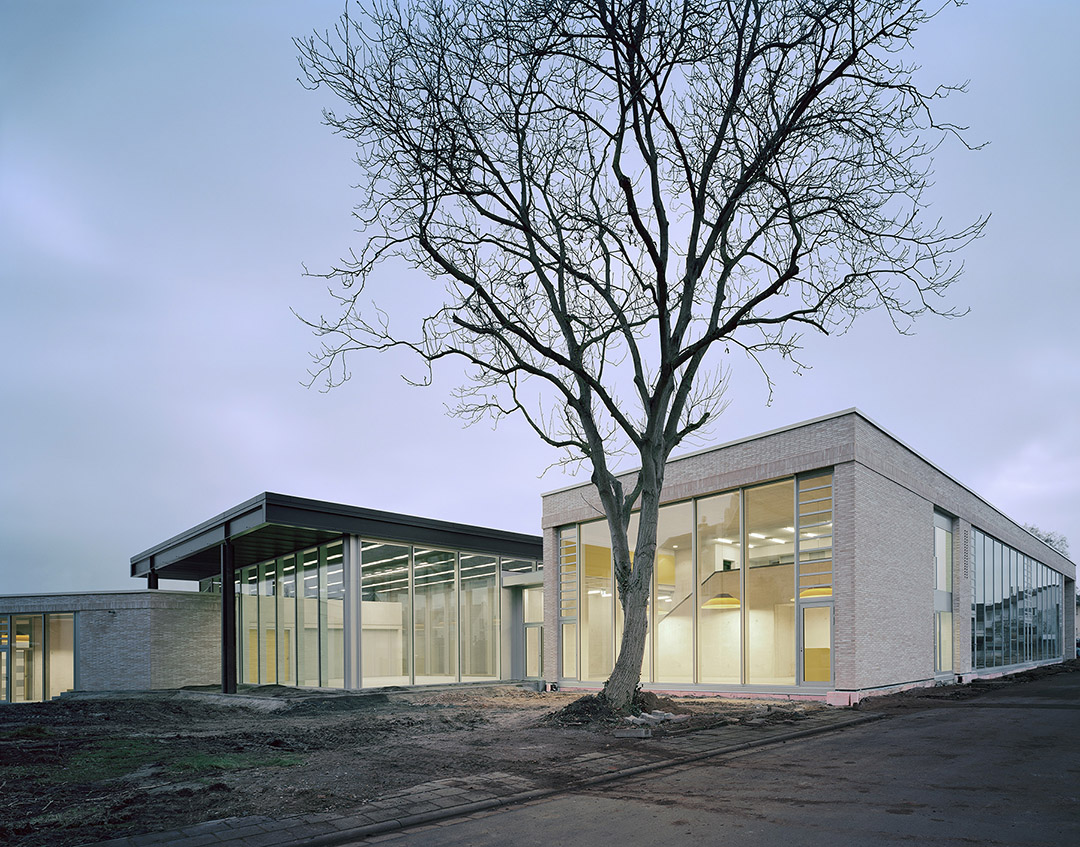 幼兒園中間的方體扭轉鏈接兩個不同方向的建筑,呈兩翼展開,在幼兒園室內的空間有明細的規劃,1-3歲的30個小孩的日托空間布置在南側,4–7歲100個小孩的日托空間布置在北側—這里每間教室的層高都是雙層,更衣間和壁柜放在屋子的后側。這兩翼建筑通過中間的扭轉方體連接,方體的功能是多功能房和餐廳。所有主要的房間都設置了落地玻璃窗,讓花園和周圍歷史環境一覽無余。
