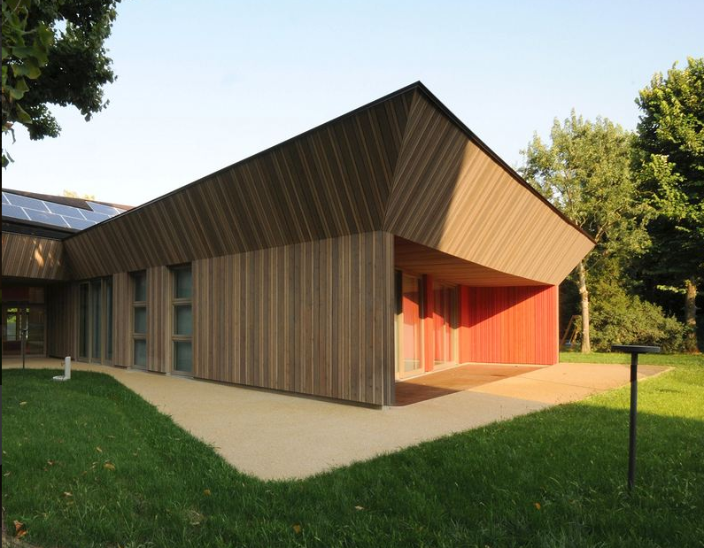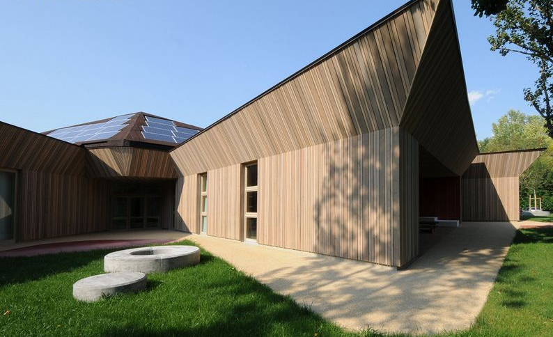 這棟建筑是由一系列連接著中心廣場的建筑群組成的,它的屋頂是不規(guī)則的幾何形狀,就像是皺紋紙一樣——這樣的形狀能更好地發(fā)揮光伏太陽能電池板的作用,這樣一來,在能源方面,這棟建筑幾乎是能夠自給自足了。建筑物的表層是由三種顏色的垂直條紋木板所組成,它們的尺寸是隨意組合的并一直延續(xù)到屋頂下的斜坡區(qū)域,形成了一種多變的紋理圖案,靜靜地被周圍的綠色所圍繞。檐廊及每片側(cè)翼的長廊仿佛是建筑群里的凹陷區(qū)域,并覆蓋了一層珊瑚紅顏色的垂直木板。這個設(shè)計好比是切片水果,里部的果肉是有色的,而外部的果皮是有紋理的。(幼兒園設(shè)計)