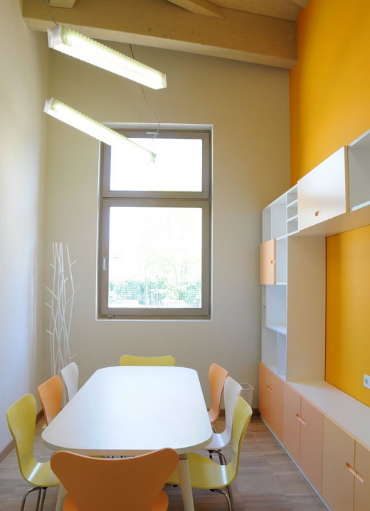 位于意大利的尼多卡利賓托兒所位于一個中型區(qū)域,通過一個中心廣場相互連通:這樣就能騰出很多空間給孩子們活動,而整個空間的比例是按照1-2歲的孩子們設(shè)計的。幾片側(cè)翼由一個單一的屋頂連接,而且都能通向中央大廳,走廊里還裝著空調(diào)。教室和“實驗室”向南分布,優(yōu)先考慮自然采光和綠化帶;辦事處和服務(wù)區(qū)(洗衣房,更衣室,儲藏室)位于北面。
