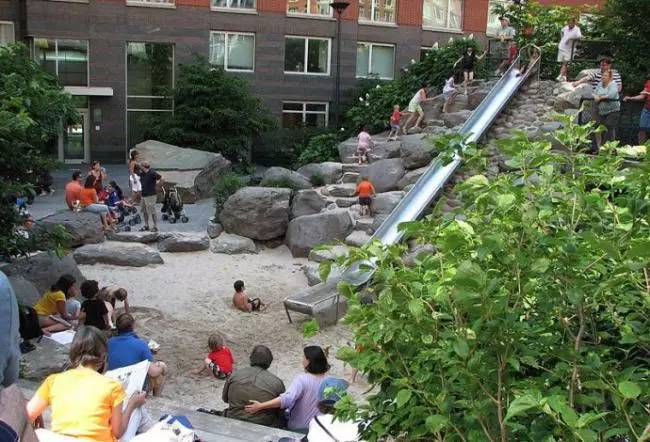 這個1.8英畝的公園里設有多個游樂場,主要設計理念是讓孩子們有更大的空間接觸自然,一年四季樂趣不斷。因為兒童是淚珠公園的主要使用者,所以公園的設計著重于城市兒童對于自然體驗的缺失:提供一處冒險的場地,找尋自然的場地,同時進行身心的鍛煉。場地的地形、特色的水景、自然的山石和繁茂的植物營造了一個擁有自然的質地、巨大反差的尺度和粗曠卻不失考究的世界。
