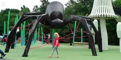 這個公園里的游樂場有巨大的蜘蛛、蛛網和蘑菇,小朋友可以在里面爬繩網、玩滑梯。
