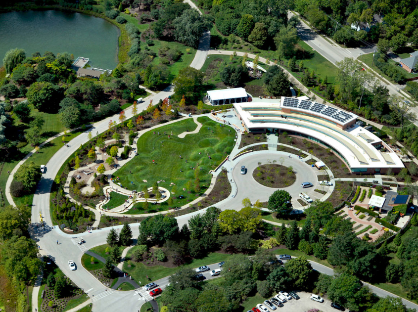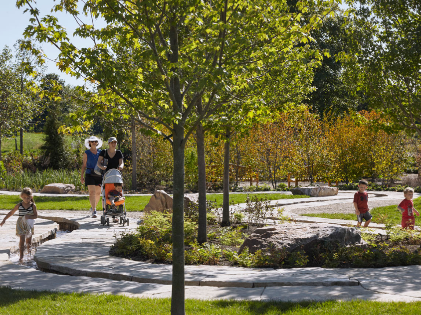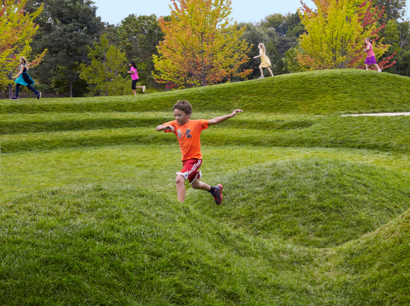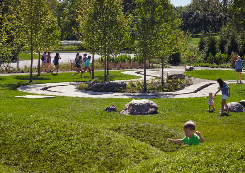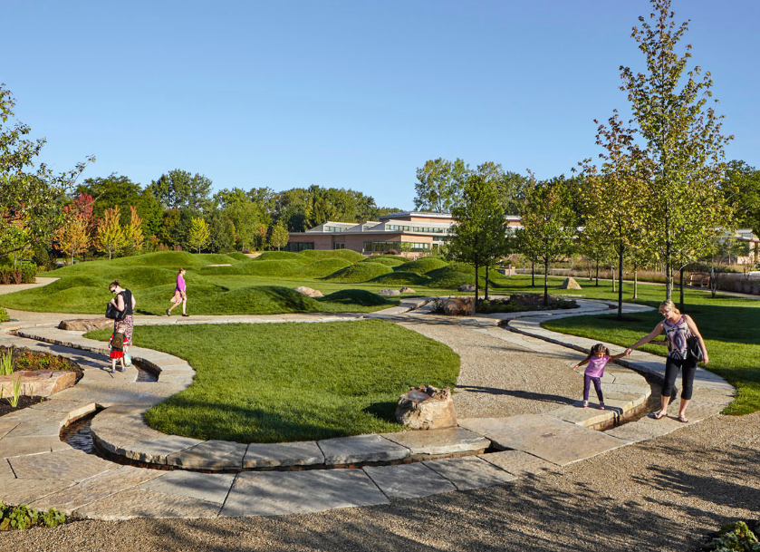 雷根斯坦學(xué)習(xí)園區(qū)是芝加哥植物園新設(shè)的環(huán)境探索中心和自然游樂場(chǎng)。這個(gè)占地六英畝的園藝園區(qū)作為科學(xué)園藝中心,為充滿活力的家庭社區(qū)服務(wù),提供與自然環(huán)境的互動(dòng)體驗(yàn),每年游客量超過12.5萬(wàn)人。該設(shè)計(jì)促使家庭和各年齡段兒童參與豐富的戶外體驗(yàn),例如以探索為導(dǎo)向的學(xué)習(xí)和游戲,從而更深入了解生態(tài)系統(tǒng)。廣闊的花園提供各種自然體驗(yàn)和探索活動(dòng),游客穿梭在草地、戲水小路、石塊、多樣的林地種植和柳枝隧道中。這個(gè)再生工程被設(shè)想為通向自然世界的門戶,一年四季提供探索與創(chuàng)造的機(jī)會(huì)。